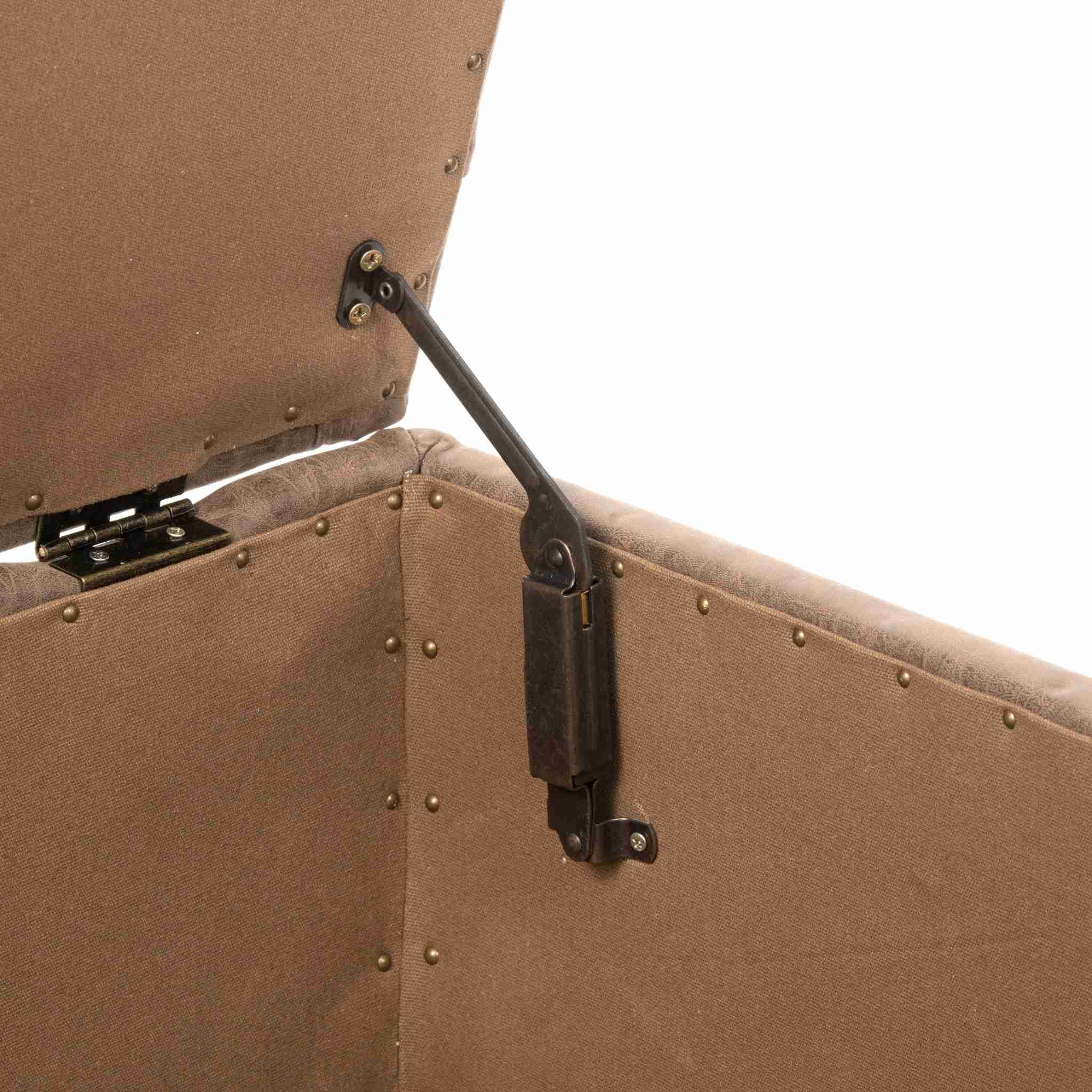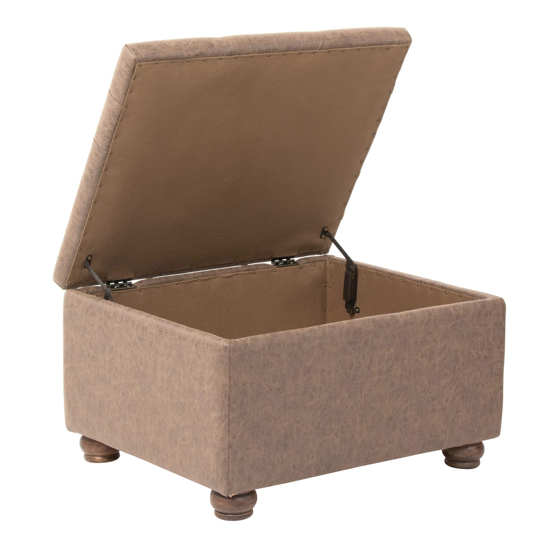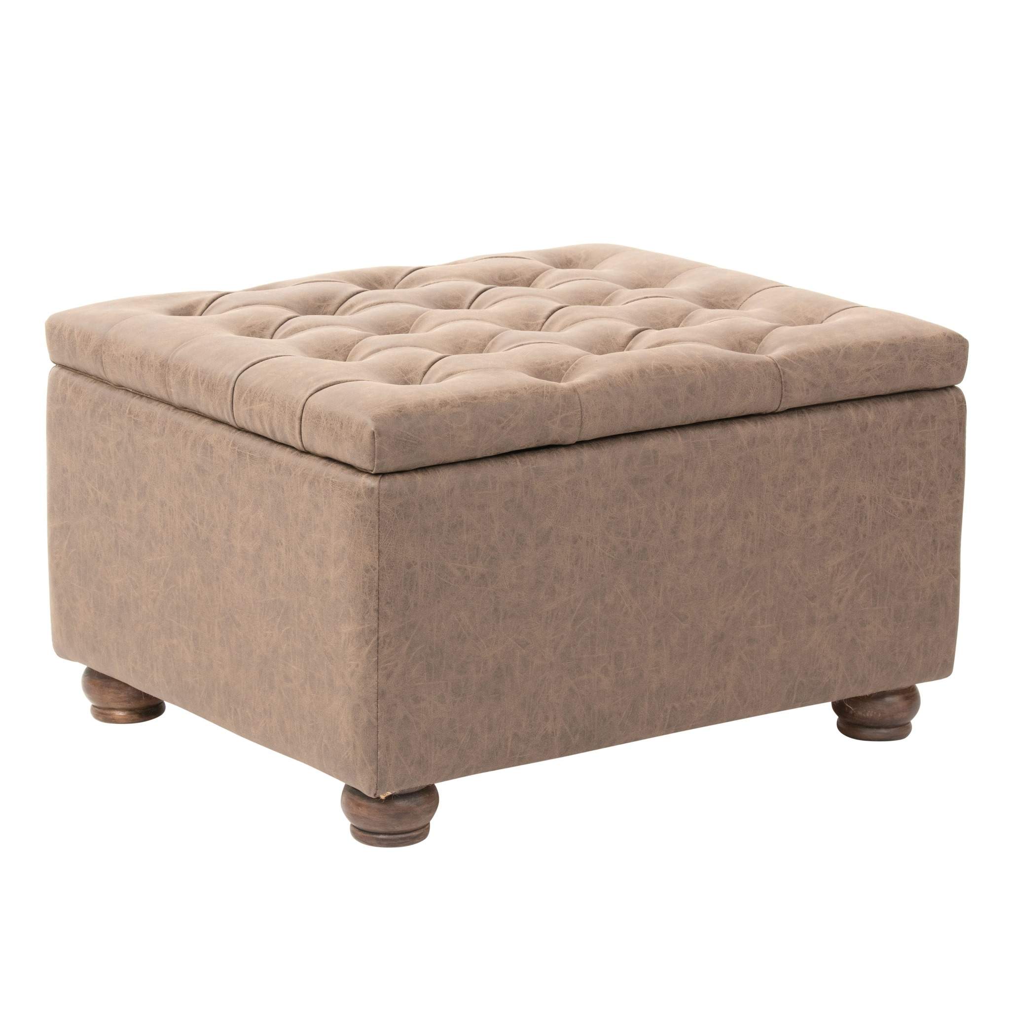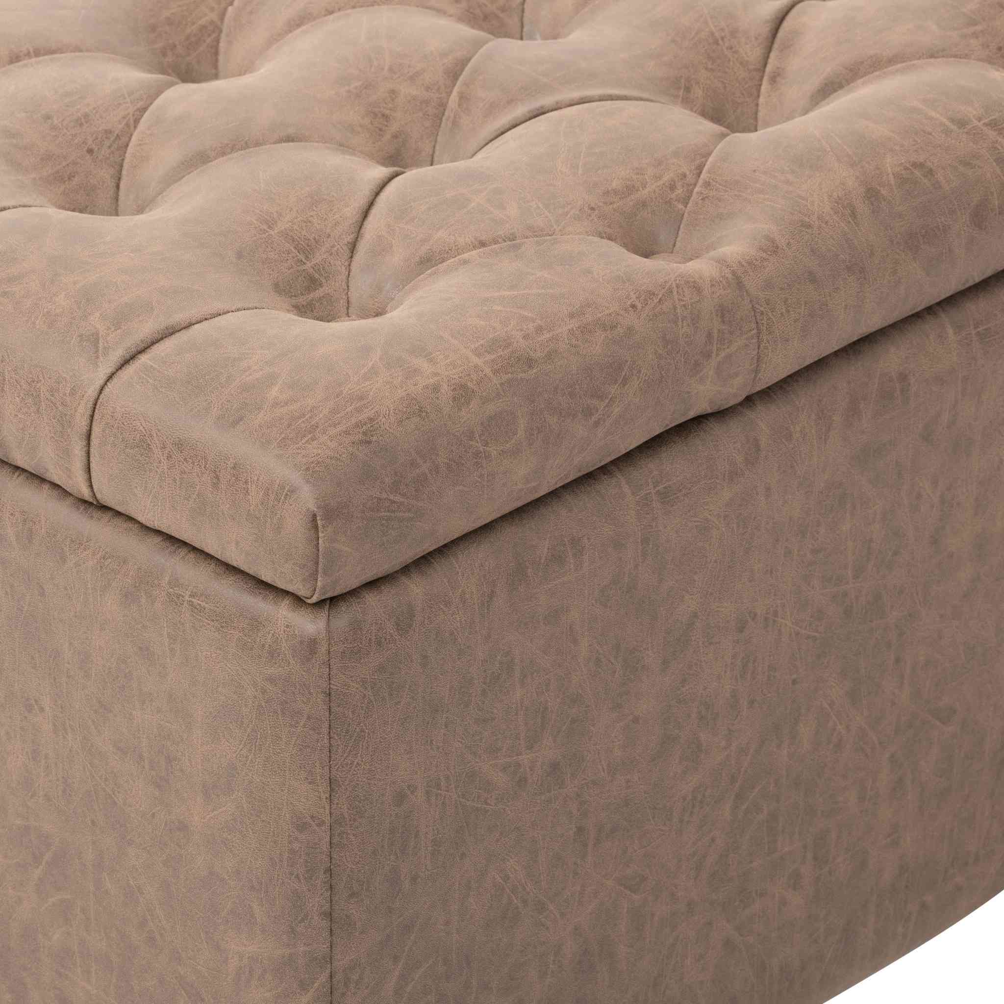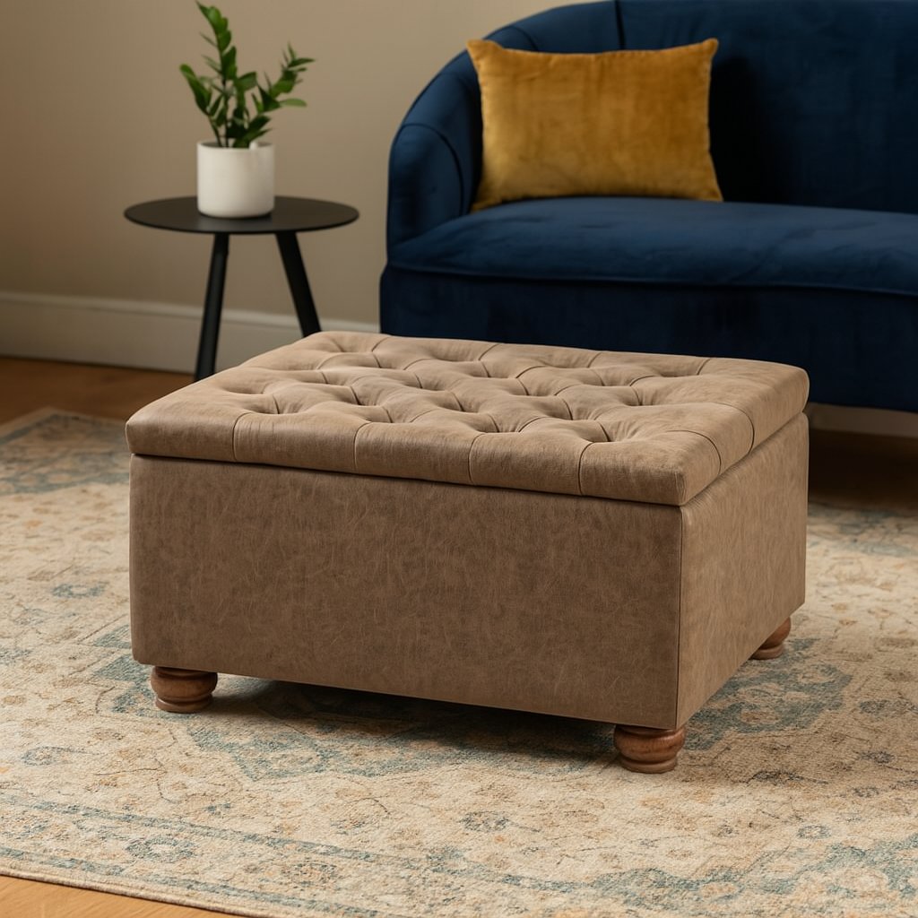 El puff Liao es una solución práctica y elegante para quienes buscan estilo y funcionalidad en un solo mueble. Su tapiz de cuero en tono café grisáceo, junto con el capitoné del asiento, le da un aire clásico y sofisticado, ideal para complementar livings, dormitorios o halls de entrada.
