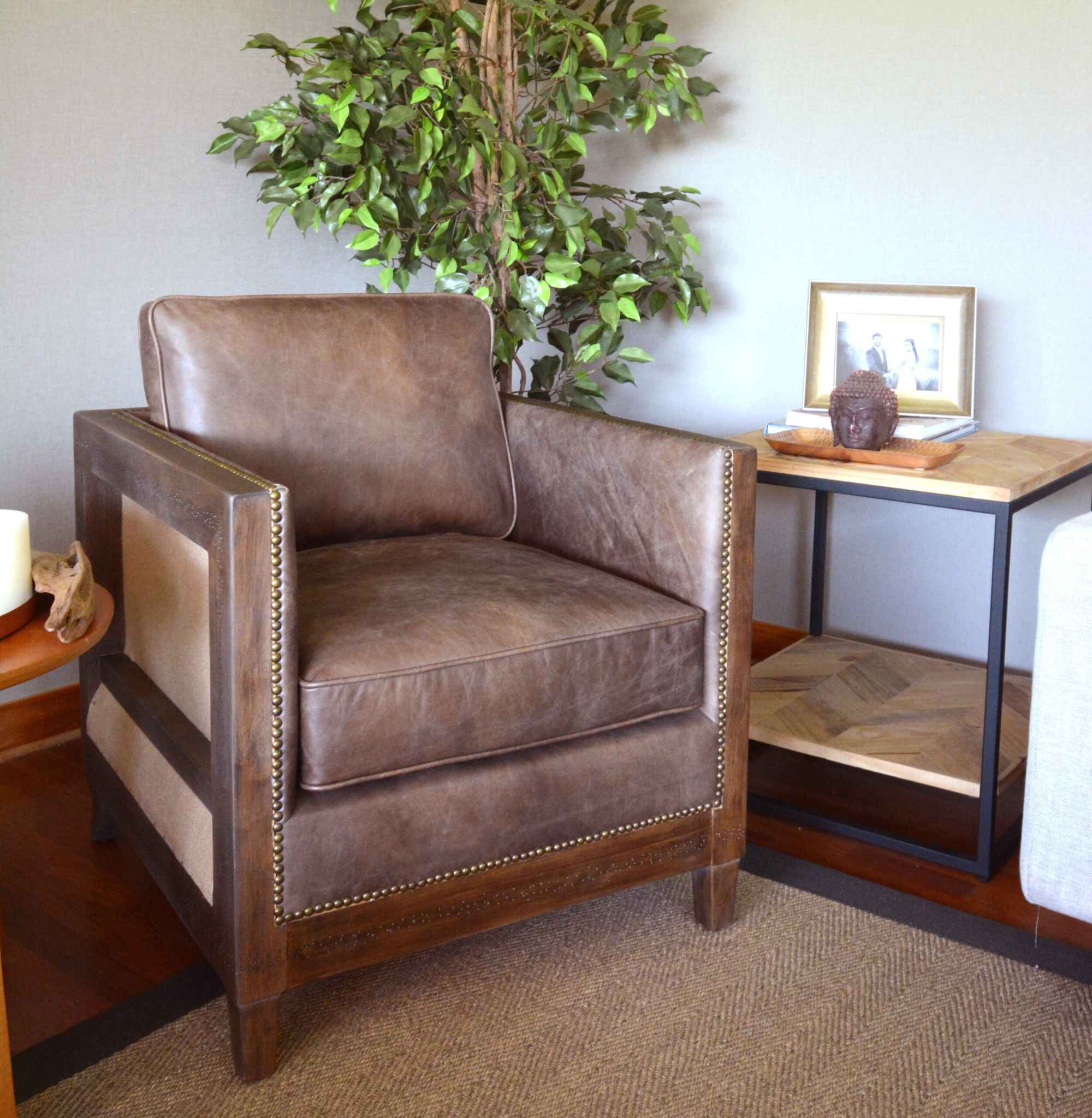 El Sillón Taroko combina elegancia y carácter artesanal en una sola pieza. Su estructura está fabricada en madera de roble, mientras que el tapiz de cuero genuino le da un toque sofisticado. Los costados y la parte trasera de arpillera añaden textura y una estética más cálida. Por lo tanto, es una opción ideal para espacios que buscan destacar con personalidad.