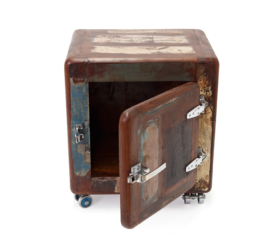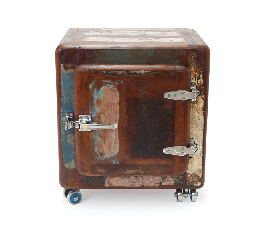 Su estructura robusta combina la calidez de la madera envejecida con el brillo metálico de sus bisagras y cerraduras tipo refrigerador antiguo, aportando un aire vintage e innovador a dormitorios, livings o rincones creativos. Además, sus ruedas metálicas facilitan el desplazamiento, permitiendo adaptarlo a distintas configuraciones del espacio.